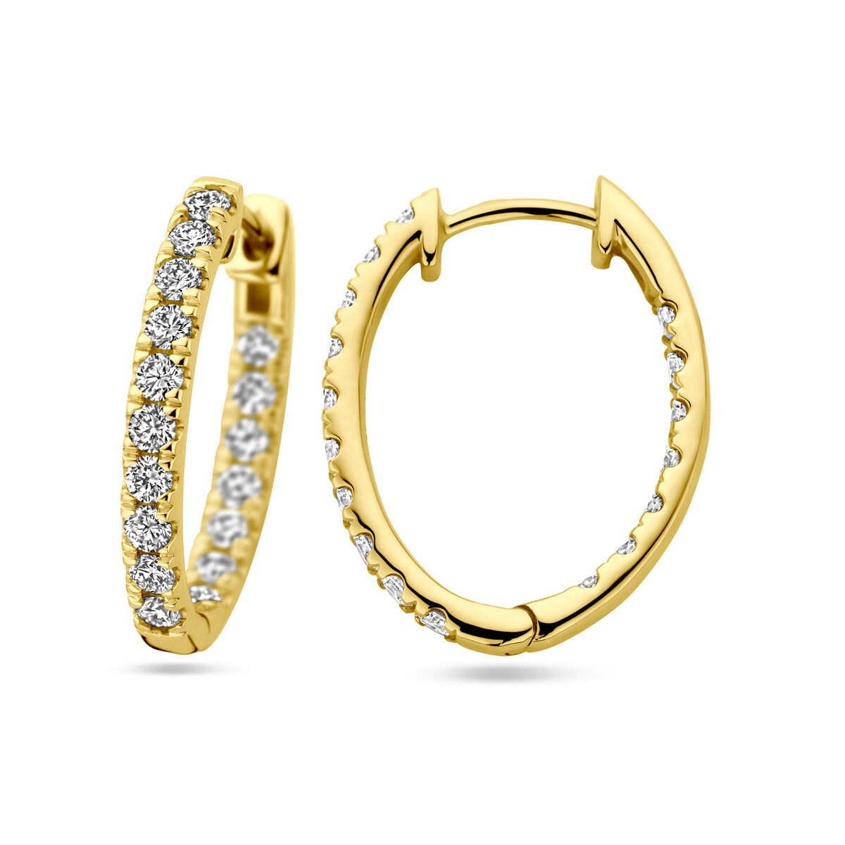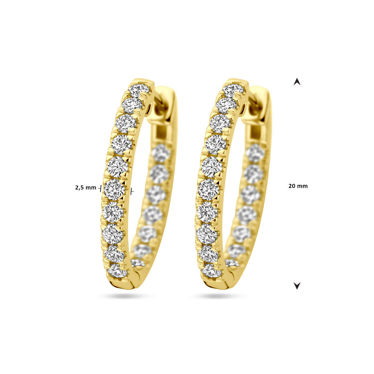 14k Geelgouden klapoorringen uitgevoerd met lab grown diamant. De klapoorringen hebben een diameter van 20mm. Het totale diamantgewicht is 0.96ct. Lab grown diamanten zijn diamanten die ontstaan in een laboratorium. Onder extreem hoge druk en temperatuur wordt het natuurlijk ontstaansproces nagebootst met als eindresultaat een diamant met dezelfde chemische eigenschappen maar met een andere oorsprong.