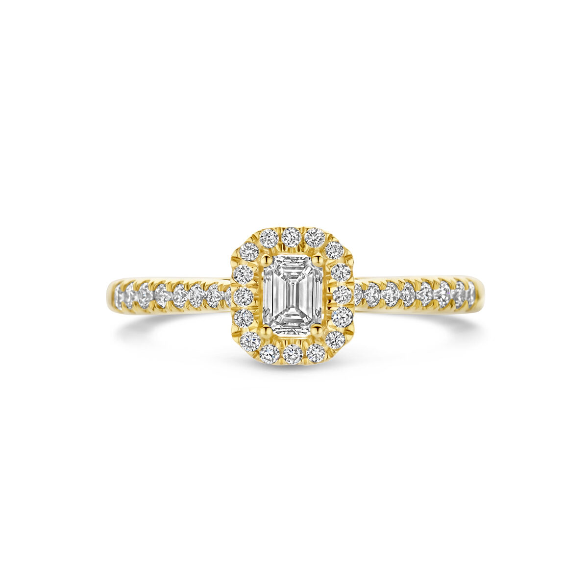 14k Geelgouden ring uitgevoerd met lab grown diamant. De ring heeft een breedte van 7mm. Het totale diamantgewicht is 0.48ct. Lab grown diamanten zijn diamanten die ontstaan in een laboratorium. Onder extreem hoge druk en temperatuur wordt het natuurlijk ontstaansproces nagebootst met als eindresultaat een diamant met dezelfde chemische eigenschappen maar met een andere oorsprong.