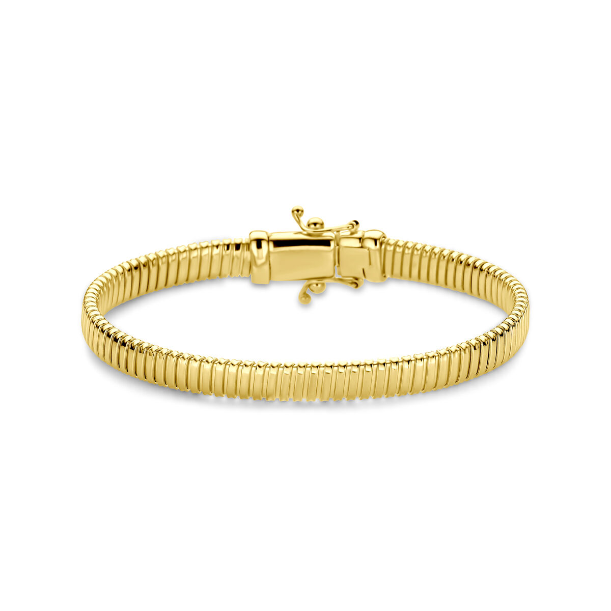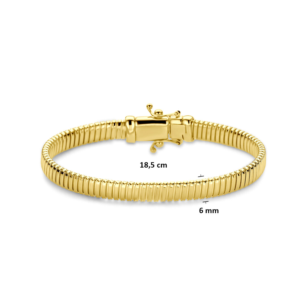 14k Geelgouden armband uitgevoerd met een tubogas schakel van 6mm. De armband heeft een draaglengte van 18.5cm.