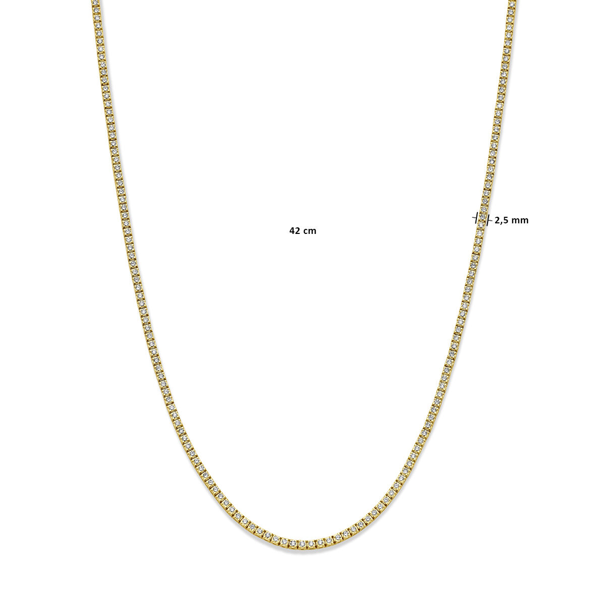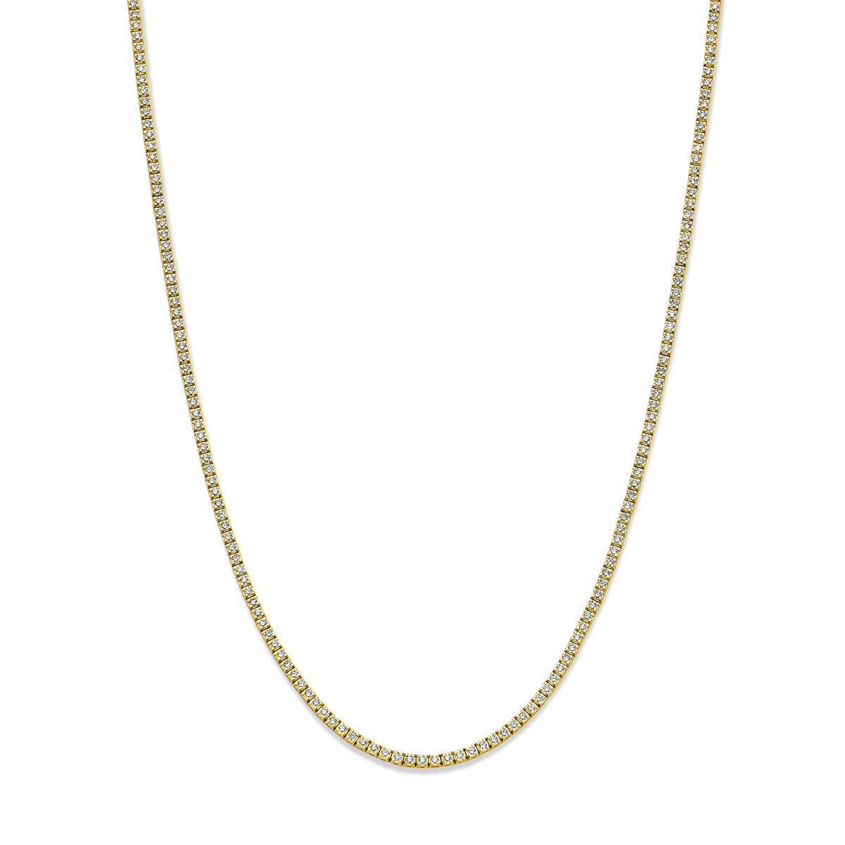14k Geelgouden tenniscollier uitgevoerd met lab grown diamanten. Het tenniscollier heeft een draaglengte van 42cm en een schakelbreedte van 2.5mm. Het diamantgewicht is 5.00ct. Lab grown diamanten zijn diamanten die ontstaan in een laboratorium. Onder extreem hoge druk en temperatuur wordt het natuurlijk ontstaansproces nagebootst met als eindresultaat een diamant met dezelfde chemische eigenschappen maar met een andere oorsprong.