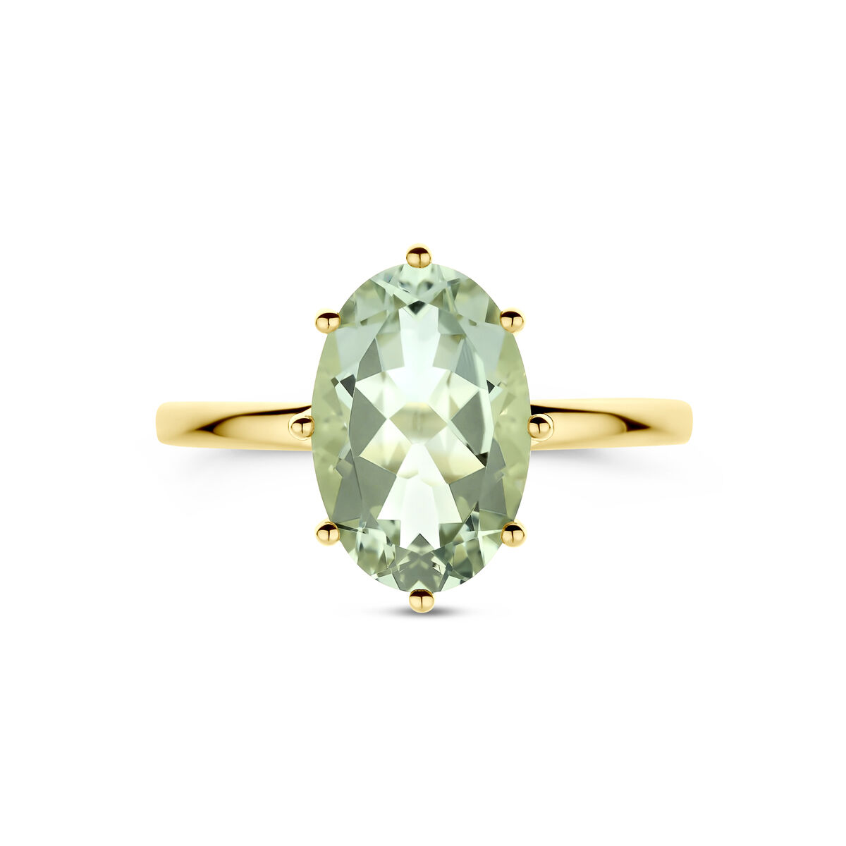 Bague en or jaune 14k sertie d'une améthyste verte. La pierre mesure 12x8mm.