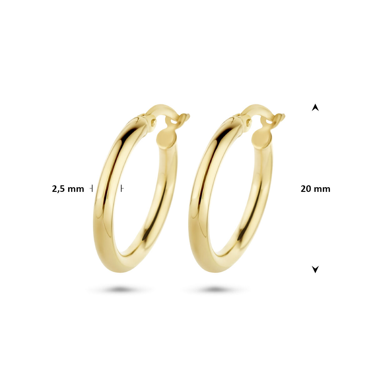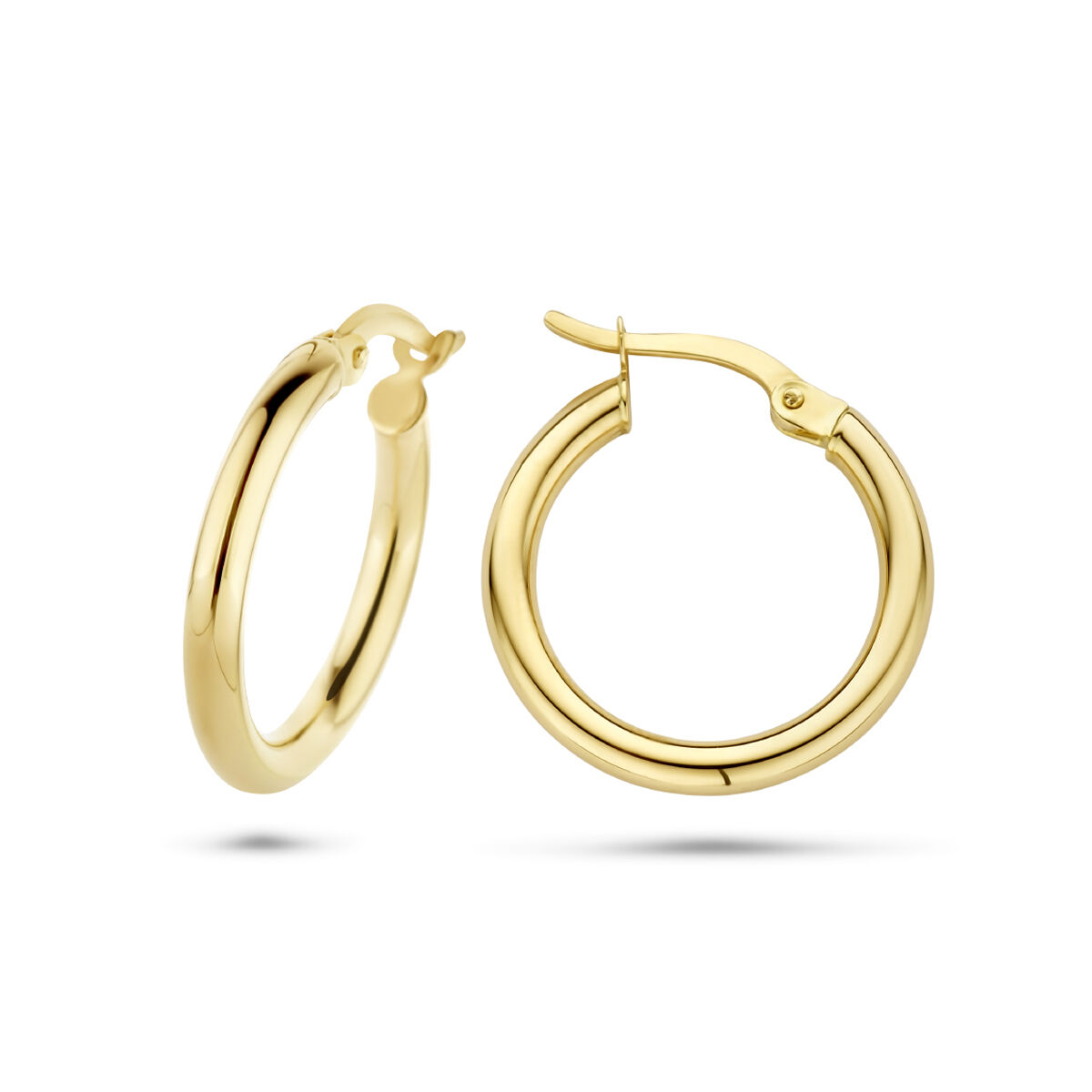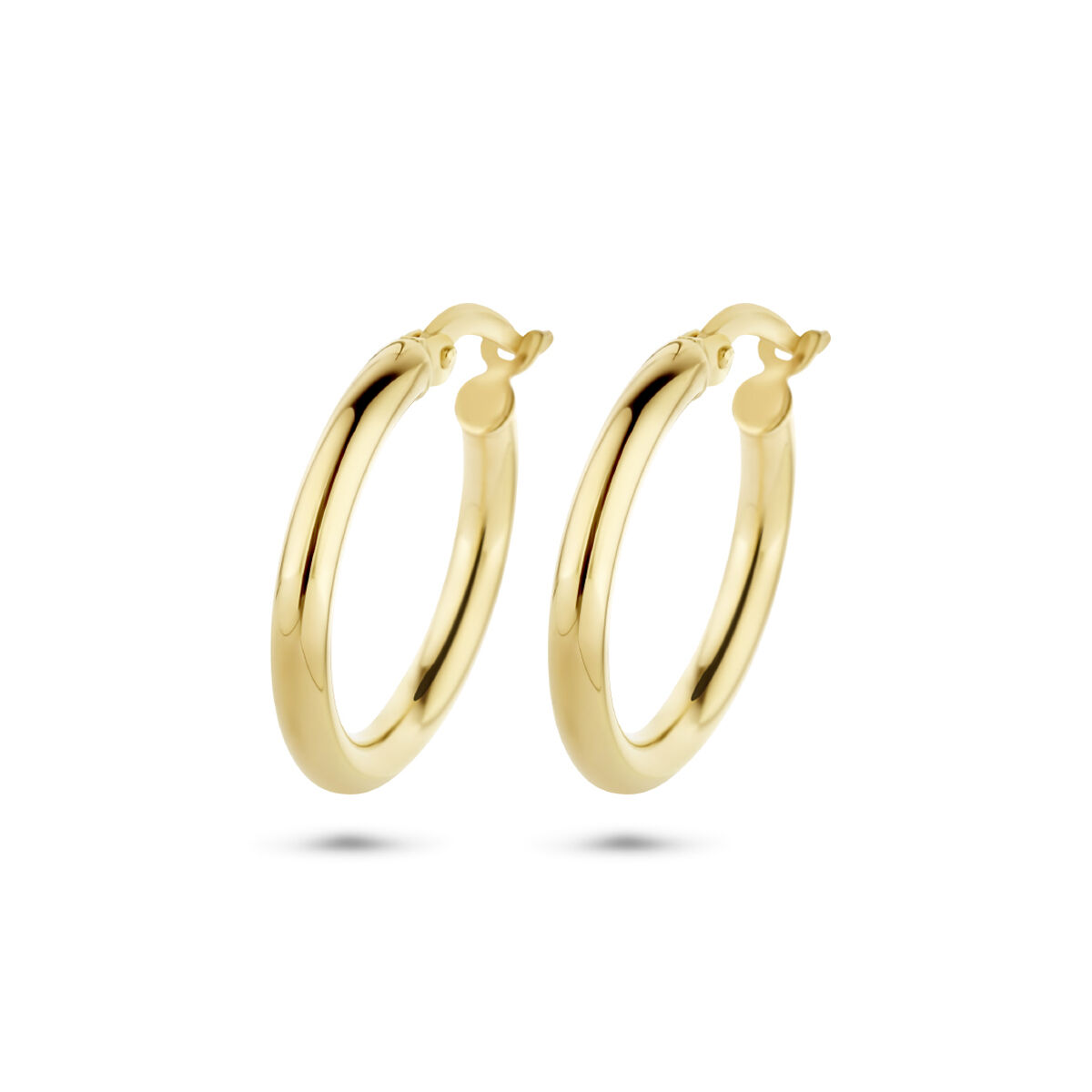 Boucles d'oreille anneaux en or jaune avec un tube rond et un fermoir à levier.