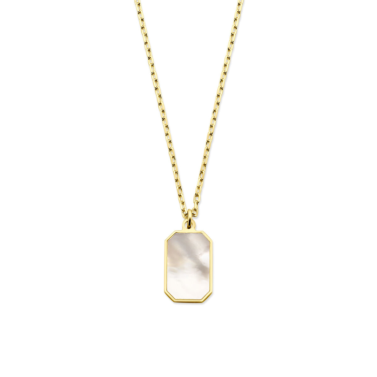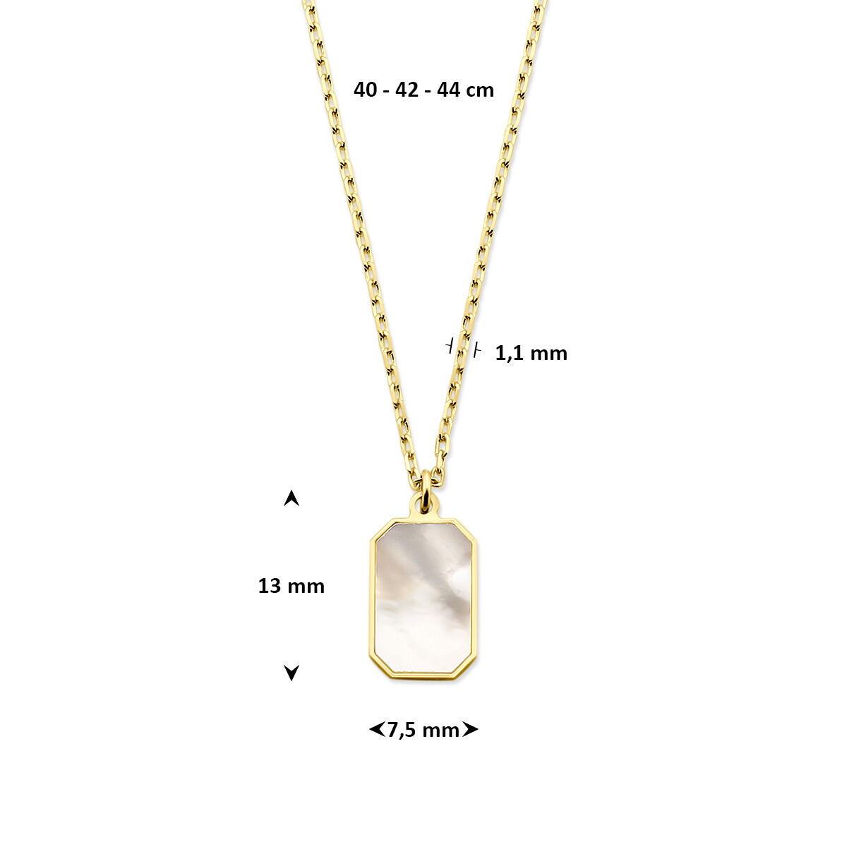 14k Geelgouden collier uitgevoerd met parelmoer. Het collier heeft draaglengtes van 40-42-44cm.