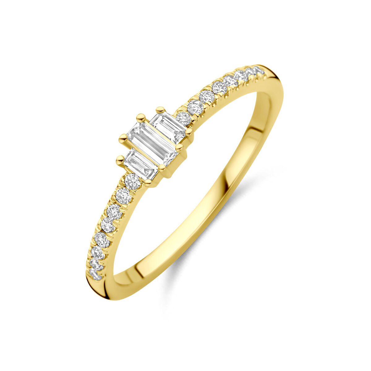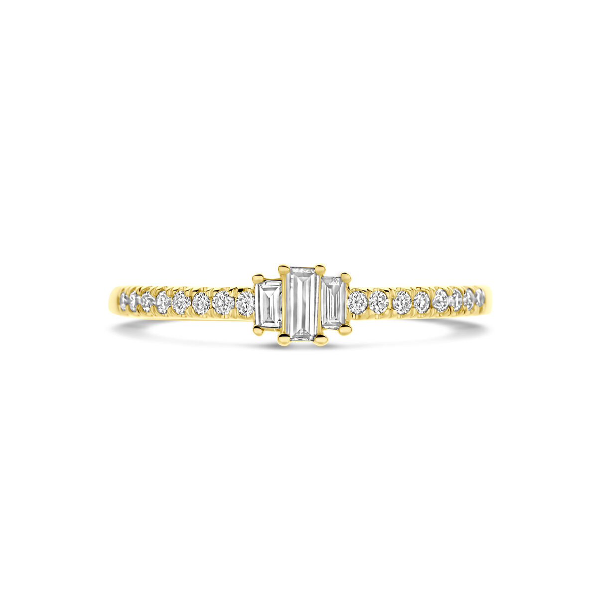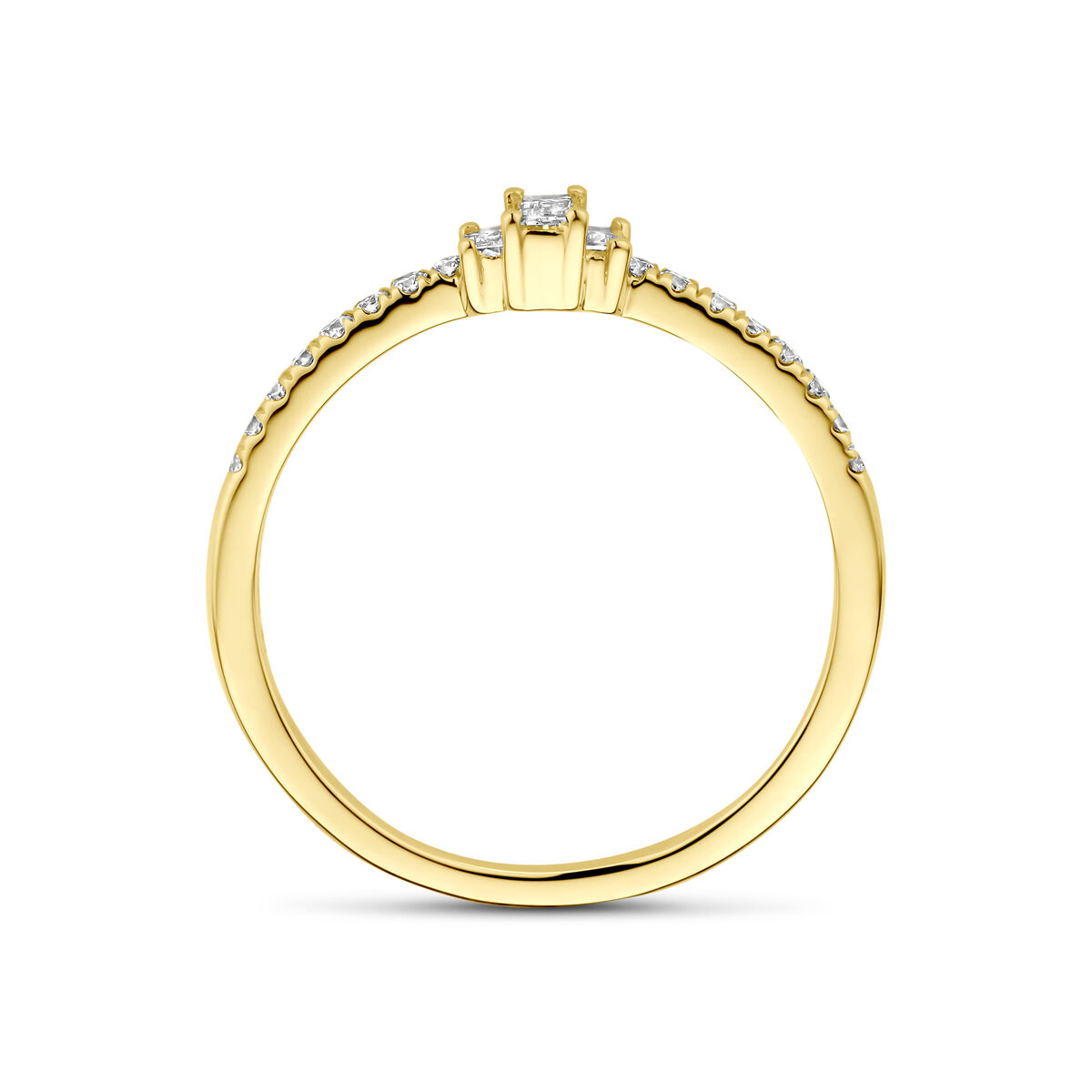 14k Geelgouden ring uitgevoerd met lab grown diamant. De ring heeft een breedte van 4.5mm. Het totale diamantgewicht is 0.21ct. Lab grown diamanten zijn diamanten die ontstaan in een laboratorium. Onder extreem hoge druk en temperatuur wordt het natuurlijk ontstaansproces nagebootst met als eindresultaat een diamant met dezelfde chemische eigenschappen maar met een andere oorsprong.