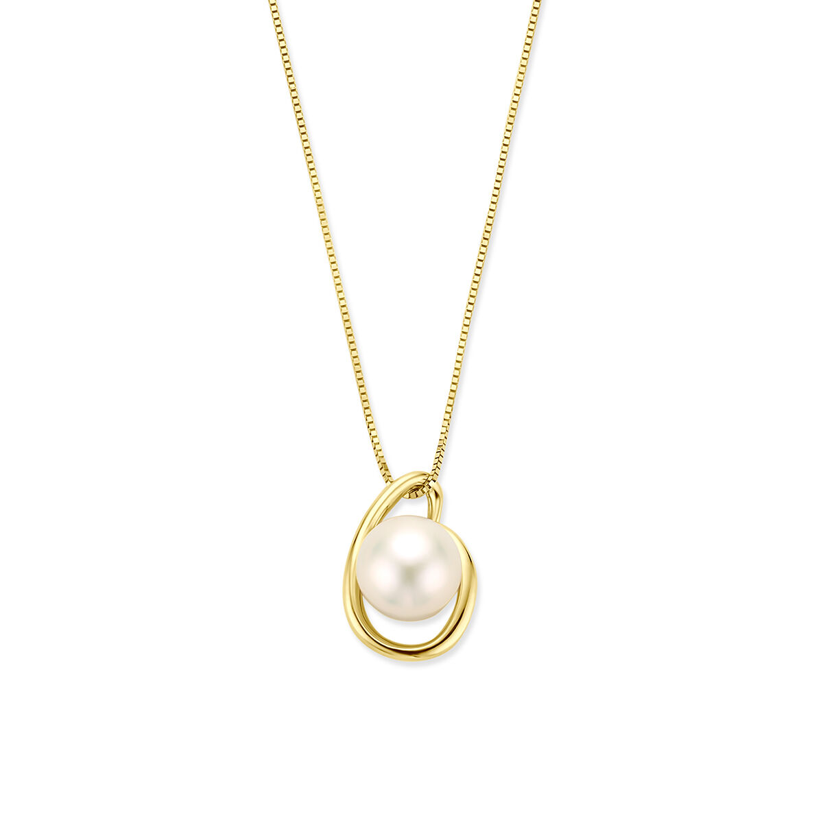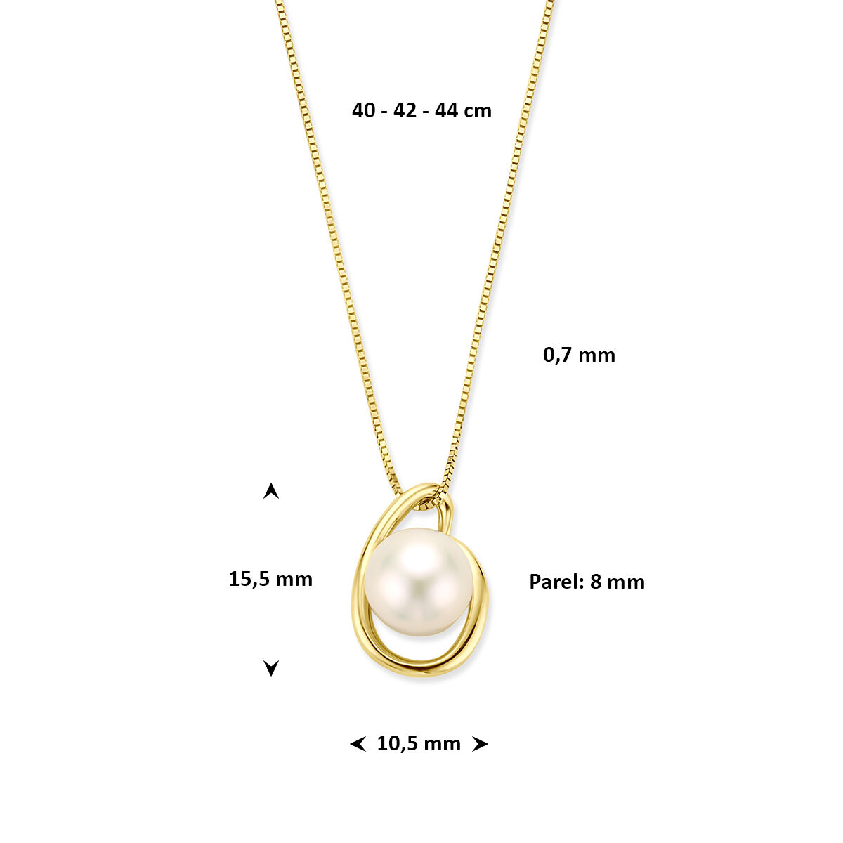 14k Geelgouden collier uitgevoerd met een parel. Het collier heeft draaglengtes van 40-42-44cm. De parel heeft een diameter van 8mm.