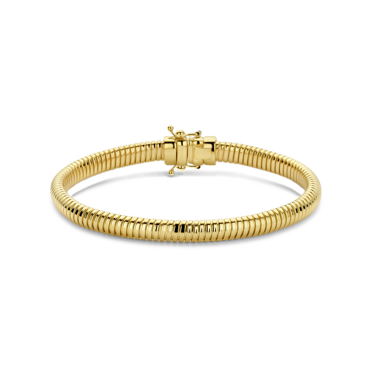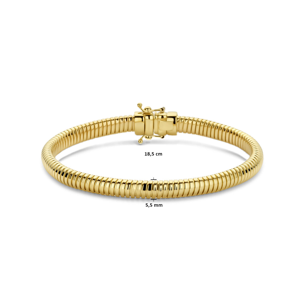 14k Geelgouden armband uitgevoerd met een tubogas schakel van 5.5mm. De armband heeft een draaglengte van 18.5cm.