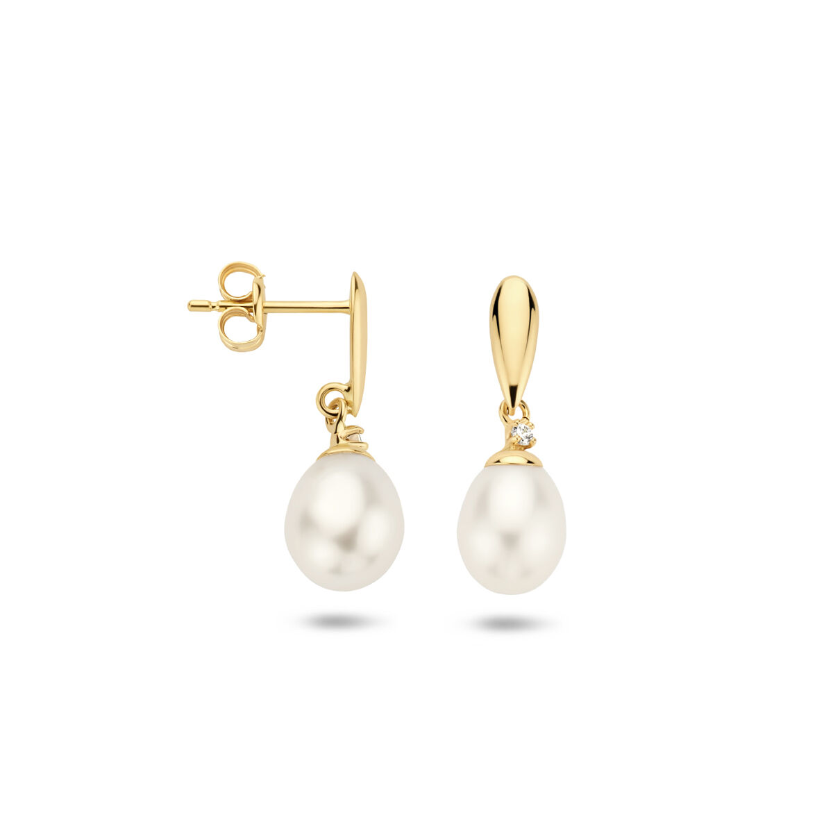 Geelgouden oorhangers met een zoetwaterparel en zirkonia. De oorhangers zijn onderdeel van een set.